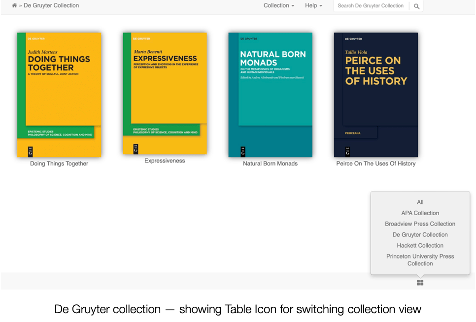 The Reading Rooms technique with its time limited but free access, via a shared link, offered a practical method of providing the APA meetings with a publisher supported showcase for new philosophy titles. Exact Editions agreed to provide small collections (4 volume) Reading Rooms without charge for any publisher invited to sponsor the APA meetings, with a modest additional charge for larger Reading Room collections (8,16, 32 etc volumes on display). Publishers who would normally set up book stands at the APA meetings could choose to have a display of their titles and would be given free use of the Reading Rooms platform as an incidental benefit beyond the relatively short term of the meetings.
