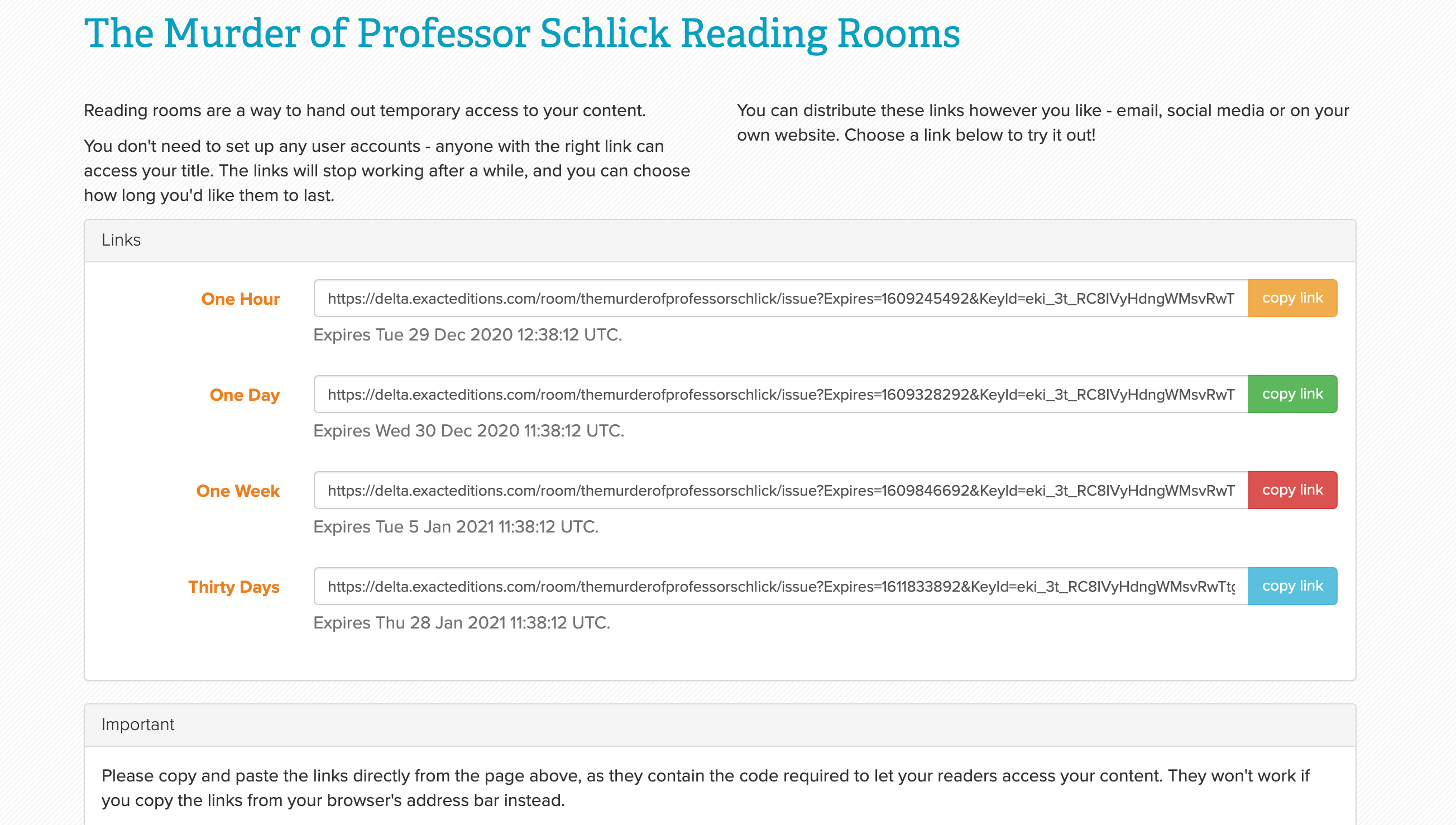 The Reading Room system has four features which are key to the way in which books can be showcased at public events: virtual conferences, interactive meetings, book fairs etc. (1) Reading Rooms are time limited and when they expire no content is available (2) the service is an access system to a database version of the book(s), so no downloads are available or offered (3) the Publisher supplies the content to be databased and initiates the making of Reading Rooms and their timing through a dashboard (4) Reading Rooms are shareable if and only if the generating link is shared – and all readers will have access to exactly the same content. There are costs to Exact Editions in supporting such a service: apart from the task of processing content to the database; maintenance; running search and serving content from the Exact Editions cloud servers. Heavy usage has already been seen from some magazine Reading Rooms, and even with much more experience is unlikely to be fully predictable.