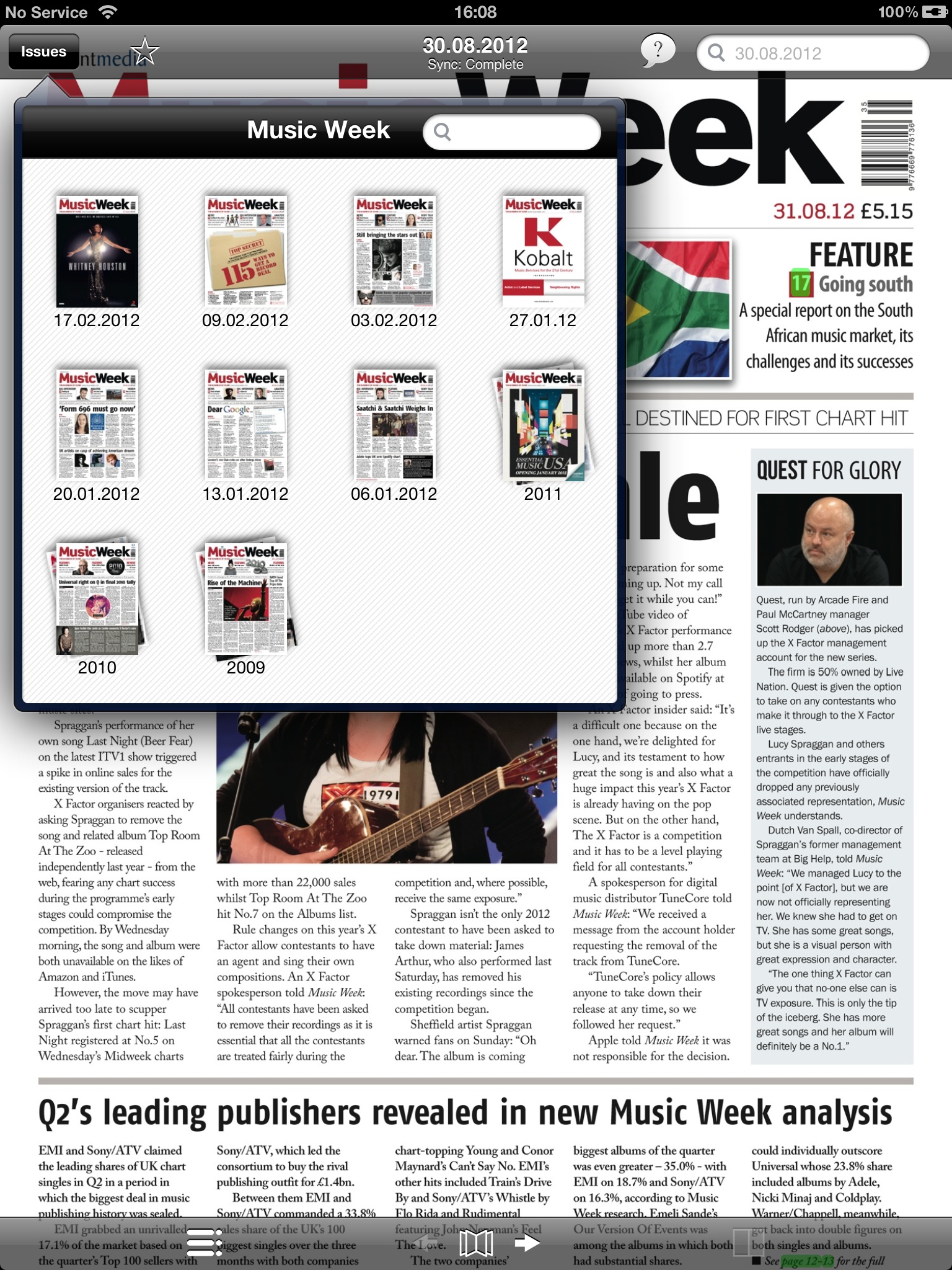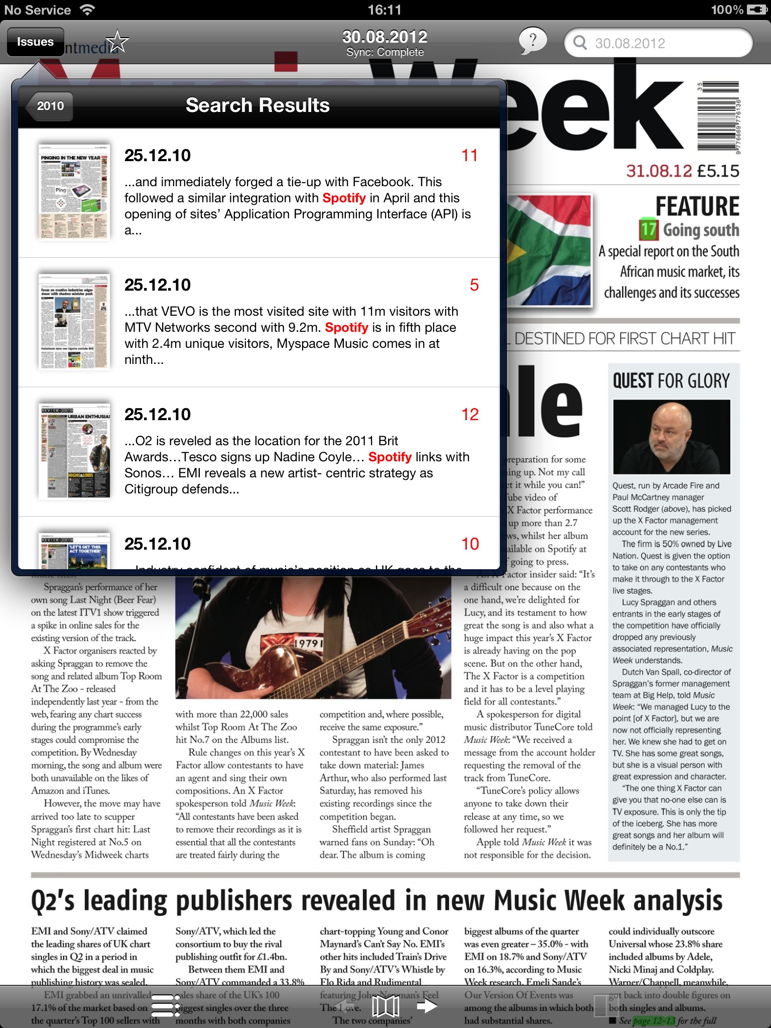 I am finding this a very natural way of navigating around 100s of back issues. It is also cool that there is now an easy way of searching a set of back issues. So I can easily find all the mentions of ‘Spotify’ in Music Week in 2011, there are quite a few!