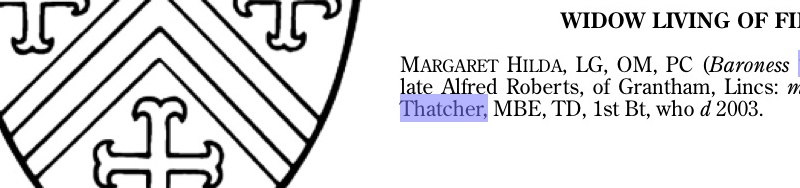 Searching Debrett’s Peerage is a free offering. It should be a useful first step for any keen family historians and amateur genealogists. The publishers are happy to provide limited free research because the snippets with which the results are presented are helpful, but do not give the game away. Here is one of the 19 fragments which the ‘Thatcher’ search threw up: